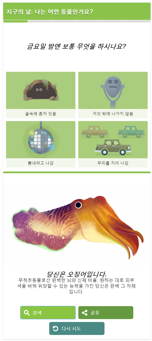 구글이 오징어 인증?…구글, '지구의 날' 맞이 퀴즈 참신해 "나는 어떤 동물인가요?"
