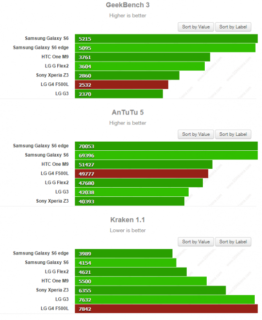 GSM아레나는 긱벤치(GeekBench3), 안투투(AnTuTu5), 크라켄(Kraken1.1) 등 3가지 벤치마크 툴을 이용해 G4의 성능을 테스트했다.