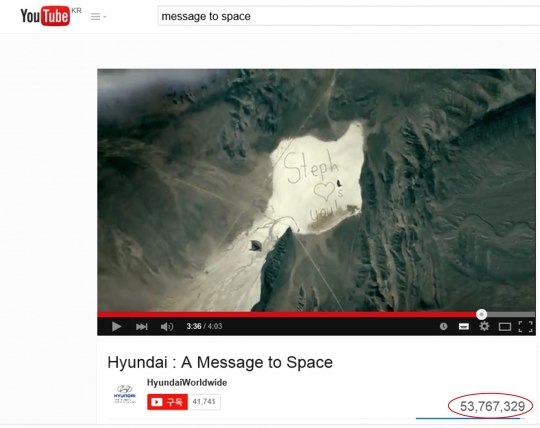 현대차가 지난 3월 선보인 '메시지 투 스페이스' 브랜드 캠페인 영상이 유튜브 조회 5000만 건을 돌파했다고 3일 밝혔다. / 현대차 제공