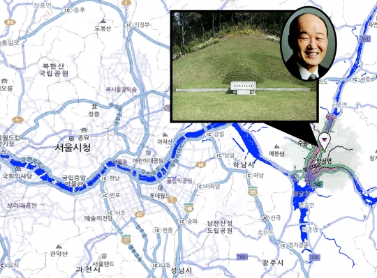 경기도 양평군 양수리에 조성된 고 정세영 현대산업개발 명예회장의 묘소 위치. 상수원보호구역으로 장지 조성이 금지된 지역이다. 사진은 정세영 회장의 생전 얼굴과 고인의 양수리 묘지 전경.