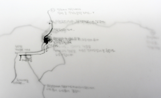 주세균 '회전 드로잉' (2015, 단채널 영상, 컬러,연속재생)·김정은 'Diary Mapping; on the road' (2015, 보드지, 스텐봉, 연필드로잉)/OCI미술관 제공