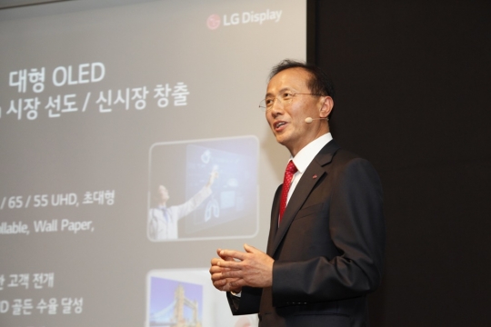여상덕 LG디스플레이 사장이 벽에 붙이는 웰페이퍼 TV와 원형기둥에 설치되는 4000R 볼로 디스플레이 등 신제품을 공개하며 향후 TV 시장 재패에 대한 자신감을 밝혔다.