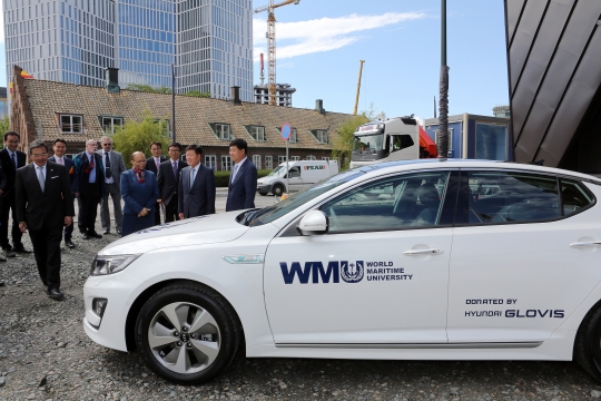 김경배 현대글로비스 사장은 19일(현지시간) 스웨덴 말뫼 WMU에서 열린 차량 기증식에서 세키미츠 고지 IMO 사무총장, 클레오파트라 둠비아 헨리 세계해사대학 총장 등과 환담하고 차량을 전달했다.