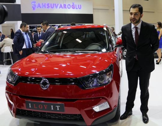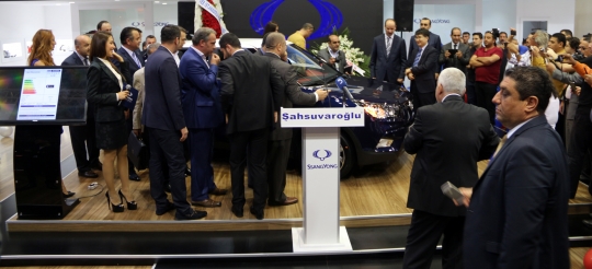 니하트 사슈바로글루 쌍용차 터키대리점 대표가 '2015 이스탄불모터쇼' 프레스데이 행사에 참석해 티볼리와 함께 기념촬영을 하고 있다. / 쌍용차 제공