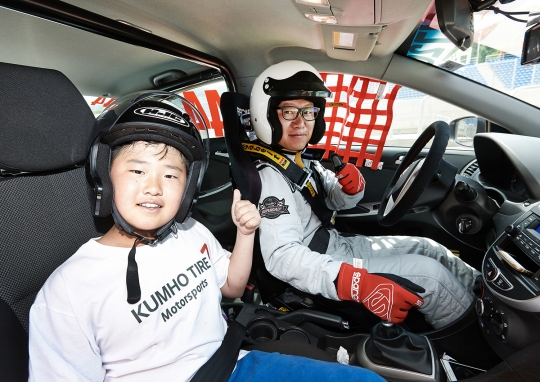 전날 강원도 인제 스피디움에서 열린 모터스포츠 교육기부 행사에 참가한 인제 초등학교 학생들이 기념 촬영을 하고 있다. / 금호타이어 제공