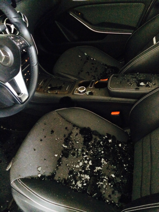 파노라마 선루프 파손으로 운전석 주위에 유리 조각이 흩어져 있다. / 보배드림 제공