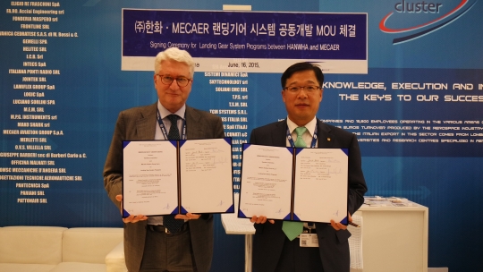 ㈜한화 항공영업총괄 박진억 상무(오른쪽)는 16일 프랑스 파리 에어쇼 현장 내 미카에르사 부스 전시관에서 랜딩기어 시스템 공동개발 양해각서를 체결했다.