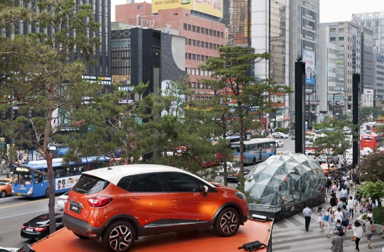 '유니크 QM3' 팝업스토어에 전시된 QM3 차량을 지나가던 행인들이 살피고 있다. / 르노삼성 제공