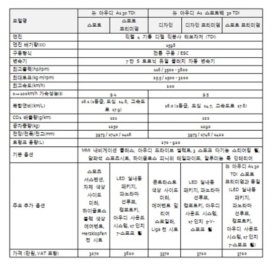 5도어 '뉴 아우디 A1 스포트백 30 TDI 디자인'은 3370만원, '뉴 아우디 A1 스포트백 30 TDI 디자인 프리미엄'과 '뉴 아우디 A1 스포트백 30 TDI 스포트 프리미엄'은 3720만원에 책정됐다.