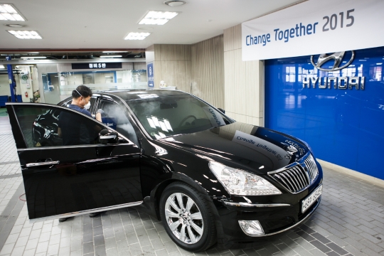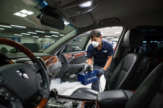 25일 현대차가 서울 동부서비스센터에 입고된 차량에 무상 항균서비스를 실시하고 있다.