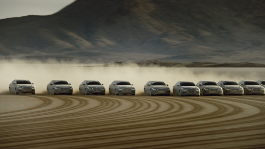 이를 위해 미국 네바다주 사막 '델라마 드라이 레이크'에서 제네시스 11대를 주행해 초대형 타이어 트랙 이미지로 딸이 직접 쓴 메시지를 사막 모래 위에 구현했다.