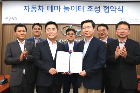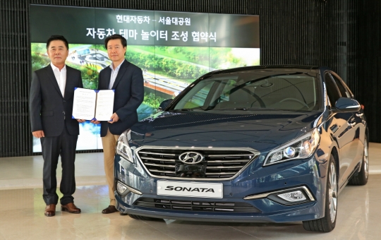 현대차 국내영업본부장 곽진 부사장(왼쪽)과 서울대공원 송천헌 원장이 서울 강남 현대차 국내영업본부 사옥에서 자동차 테마 놀이터 조성 협약을 맺고 있다.