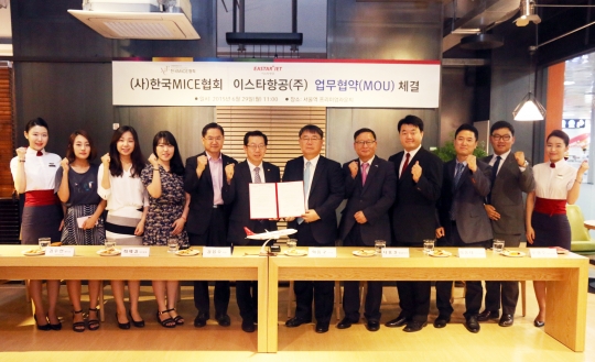 김응수 한국마이스협회 회장(중앙 좌측)과 최종구 이스타항공 부사장(중앙 우측) 등의 관계자들이 참석한 가운데 업무협약을 기념해 사진 촬영을 하고 있다. / 이스타항공 제공