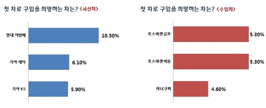 수입차 부문에서는 폭스바겐 골프(5.3%), 폭스바겐 비틀(5.3%) 미니 쿠퍼(4.6%)를 희망하는 첫 차로 꼽았다.