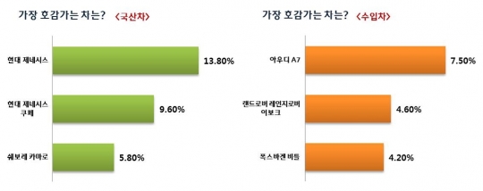 국산차 부문에서는 현대자동차 제네시스(13.8%), 제네시스 쿠페(9.6%), 쉐보레 카마로(5.8%)가 인기를 얻었다.