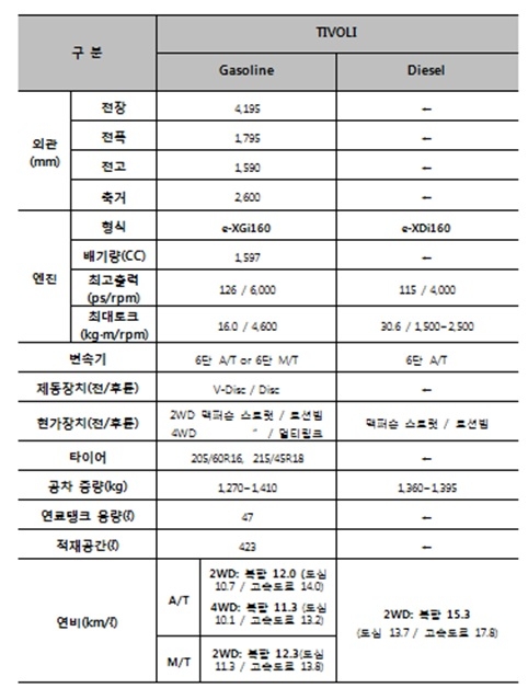 쌍용차 티볼리 제원 / 쌍용차 제공