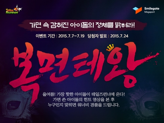 스마일게이트 메가포트는 자사가 서비스하는 온라인 액션 레이싱 게임 '테일즈런너'에서 오늘부터 19일까지 "복면테왕-가면 속 감춰진 아이돌을 맞혀라" 이벤트를 실시한다고 7일 밝혔다.