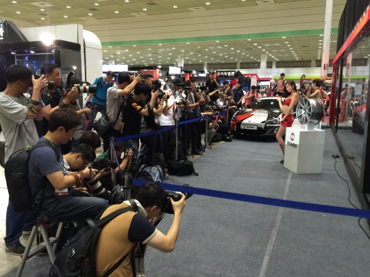 자동차 휠 제작사인 핸즈코퍼레이션 포토존이 사진 기자를 비롯한 관람객들로 붐비고 있다.
