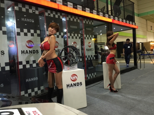 핸즈코퍼레이션이 제작한 자동차 휠(바퀴) 옆에서 모델들이 포즈를 취하고 있다.