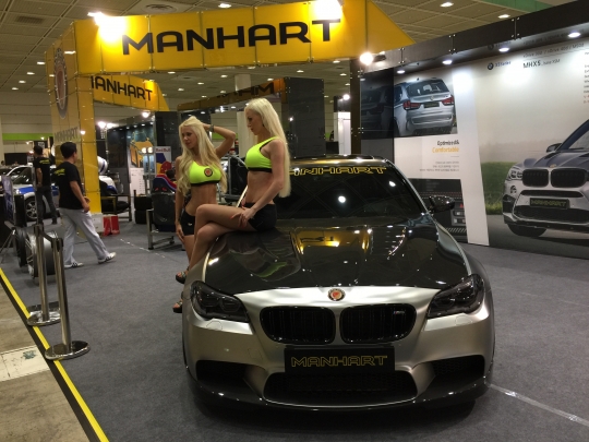 BMW 전문 튜닝 업체 만하트 부스에서 모델이 포즈를 취하고 있다.