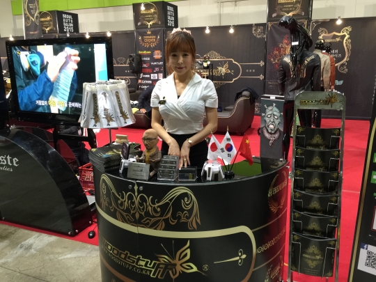 우드스터프 부스에서 모델이 포즈를 취하고 있다.