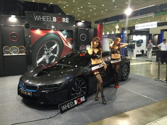 휠 보호용품 업체 휠보레 부스에서 레이싱 모델들이 튜닝된 BMW i8 옆에서 포즈를 취하고 있다.
