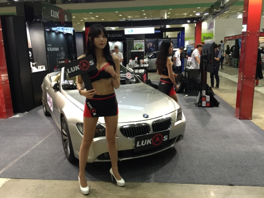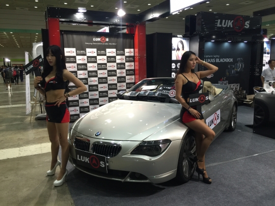 자동차 블랙박스 제조사 루카스 부스에서 레이싱 모델이 포즈를 취하고 있다.