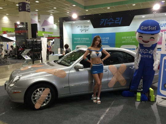 자동차 수리 비교 견적 앱 카수리 부스에서 레이싱 모델이 포즈를 취하고 있다.