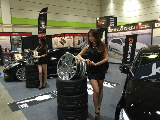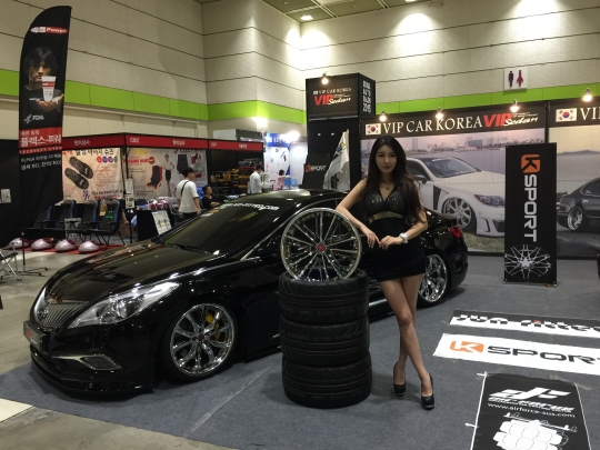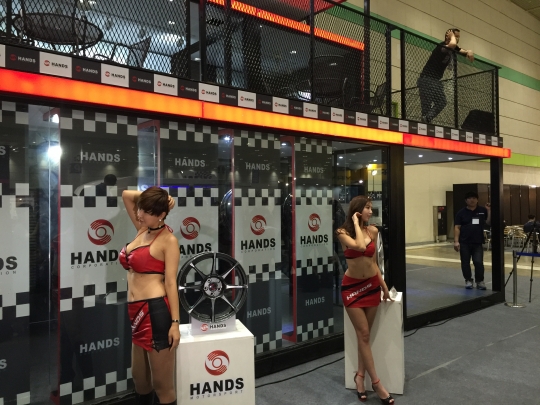 핸즈코퍼레이션이 제작한 자동차 휠(바퀴) 옆에서 모델들이 포즈를 취하고 있다.