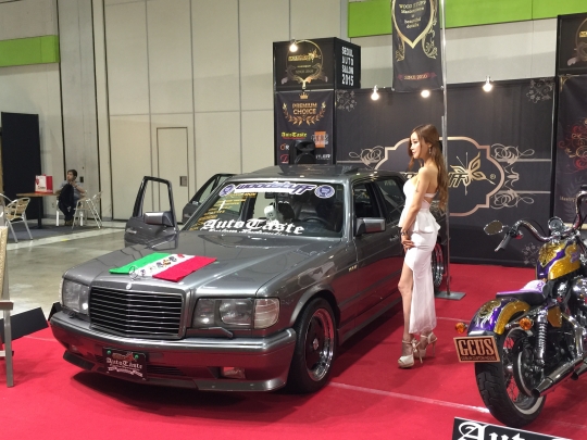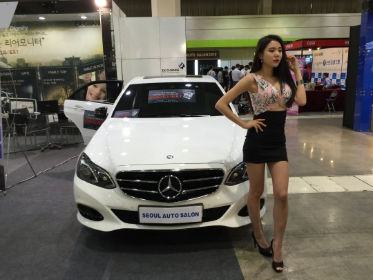 우드스터프 부스에 전시된 메르세데스-벤츠 튜닝 차량 옆에서 레이싱 모델이 포즈를 취하고 있다.