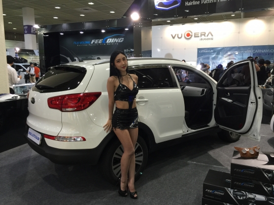 튜닝된 기아자동차 스포티지 옆에서 레이싱 모델이 포즈를 취하고 있다.