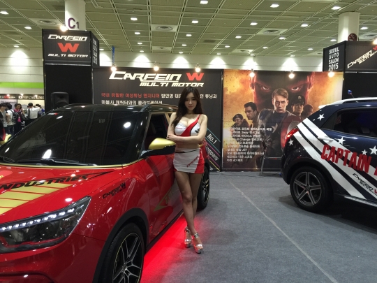 BMW 전문 튜닝 업체 만하트 부스에서 모델이 포즈를 취하고 있다.