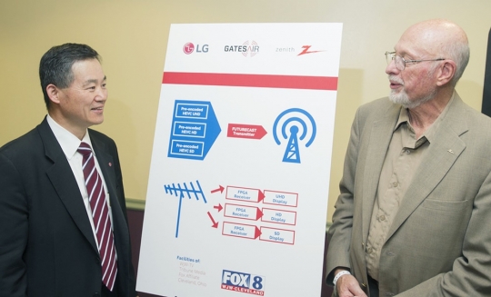 LG전자가 9일(현지시각) 미국 오하이오주 클리블랜드에서 미국 방송사 트리뷴(Tribune)과 방송장비업체 게이츠에어(GatesAir)와 공동으로 ATSC 3.0 기술 기반의 실험방송 송수신을 공개 시연했다. LG전자 CTO부문 제니스연구소장 김종규 전무와 제니스연구소 웨인 러플로(Wayne Luplow) 상무가 ATSC 3.0 개념도를 설명하고 있다.