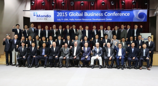 12일 한라 인재개발원에서 열린 글로벌 경영전략회의 참석자들이 파이팅을 외치고 있다.