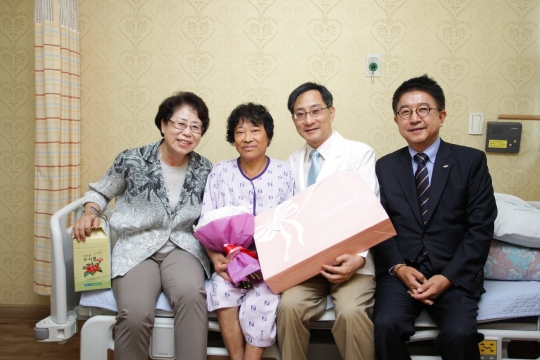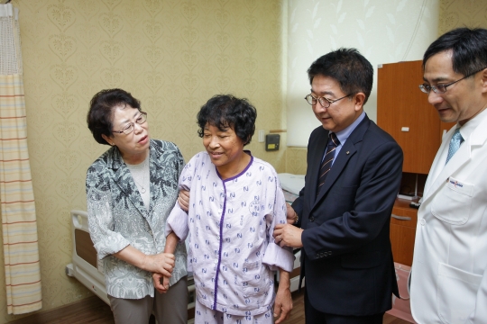 13일 인천 부평동 힘찬병원에서 한국지엠 대외정책본부 한주호 부사장(오른쪽), 홍미영 부평구청장(왼쪽), 이수찬 상원의료재단 이사장(왼쪽 두 번째)이 저소득가정 지원 협약의 첫 수혜자인 김혜성씨를 병문안하고 있다.