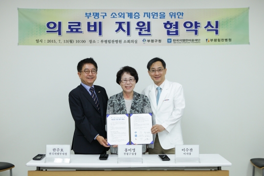 13일 인천 부평동 힘찬병원에서 열린 저소득가정 지원 상호협약식에서 (왼쪽부터) 한국지엠 대외정책본부 한주호 부사장, 홍미영 부평구청장, 이수찬 상원의료재단 이사장이 협약서에 서명한 뒤 들어 보이고 있다.