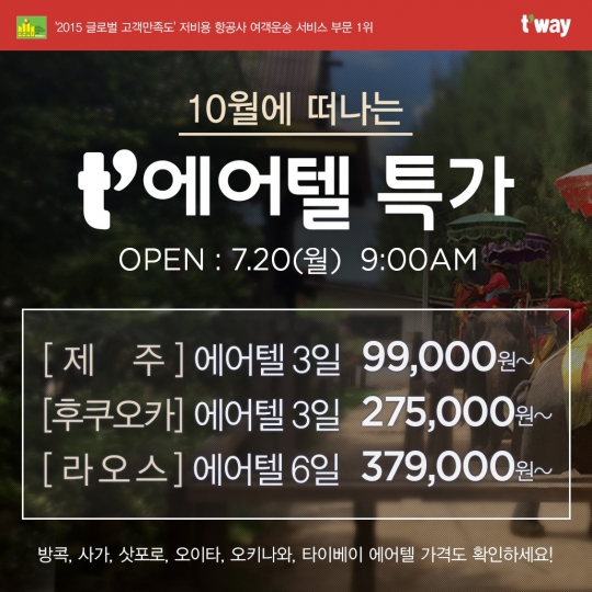왕복 항공권과 호텔이 포함된 10월 출발 t'에어텔의 상품 가격은 제주 2박3일 9만9000원, 사가 2박3일 25만5000원, 오이타 2박3일 27만5000원, 후쿠오카 2박3일 27만5000원, 오키나와 3박4일 43만900원, 삿포로 3박4일 38만400원, 타이베이 2박3일 35만원, 비엔티안 4박6일 37만9000원, 방콕 3박5일 39만8000원부터 판매 된다.