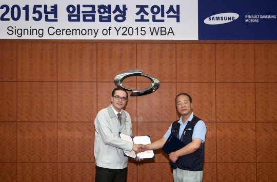 27일 열린 2015 임금협상 조인식에서 프랑수아 프로보 르노삼성 사장과 최오영 르노삼성노조 위원장이 악수하며 사진 촬영을 하고 있다. / 르노삼성 제공