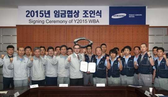 27일 열린 2015 임금협상 조인식에서 프랑수아 프로보 르노삼성 사장과 최오영 르노삼성노조 위원장이 사진 촬영을 하고 있다. /르노삼성 제공