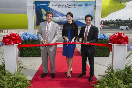 진에어의 737-800 항공기 인수식에서 조현민 진에어 전무(가운데)와 이산 무니어 보잉 동북아시아 세일즈 선임 부사장(우측), 존 플루거 에어 리스 코퍼레이션 사장이 리본 커팅식을 진행하고 있다. / 진에어 제공