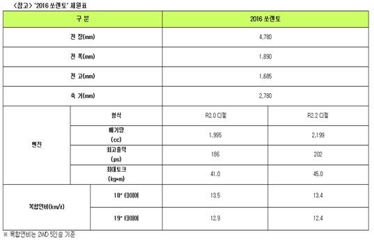 기아차 2016 쏘렌토 제원표 / 기아차 제공
