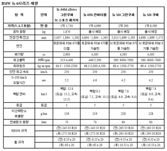 4가지 라인업은 뉴 640d xDrive 그란쿠페 M 스포츠 패키지, 뉴 650i 컨버터블 그리고 고성능부문의 뉴 M6 그란쿠페와 뉴 M6 쿠페 등이다.