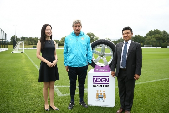 강호찬 넥센타이어 사장(오른쪽), 마누옐 페예그리니 맨시티 감독(가운데), 강 사장의 부인이 파트너십 체결을 기념해 사진 촬영을 하고 있다. / 넥센타이어 제공