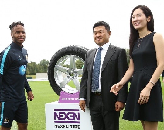 강호찬 넥센타이어 사장(가운데)과 그의 부인(오른쪽) 그리고 라힘 스털링 맨시티 선수가 파트너십 체결을 기념해 사진 촬영을 하고 있다. / 넥센타이어 제공