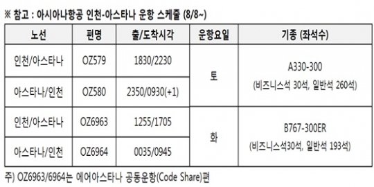 아시아나항공의 인천-아스타나 운항 스케줄표 / 아시아나 제공