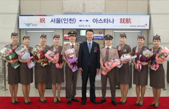 8일 인천국제공항에서 열린 아시아나항공 인천-아스타나 신규취항식에서 김수천 아시아나항공 사장(좌측 여섯 번째)이 취항편 운항승무원 및 캐빈승무원들과 기념촬영을 하고 있다. / 아시아나 제공