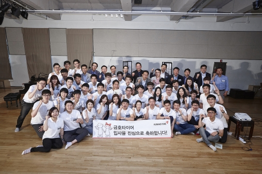 7일 대학로에서 금호타이어 신입사원을 포함한 임직원들이 하우스 콘서트를 관람한 후 기념촬영을 하고 있다. / 금호타이어 제공