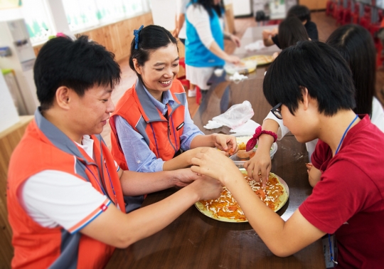 한국타이어 임직원과 가족들이 봉사활동 프로그램에 참여해 장애 아동들과 함께 피자 치즈를 만들고 있다. / 한국타이어 제공