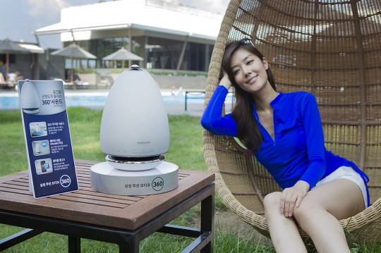 삼성전자 모델이 13일 경기도 가평에 위치한 '아난티 클럽 서울 야외 수영장'에서 '무선 360 오디오' R6 포터블을 소개하고 있다. 삼성전자는 10일부터 이달 말까지 '아난티 클럽 서울 야외 수영장'에서 내장 배터리로 휴대가 간편한 이동형 '무선 360 오디오' R6 포터블을 고객들에게 대여해 야외에서 듣는 생생한 음악의 경험을 제공하고 있다. /삼성전자 제공