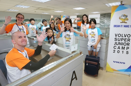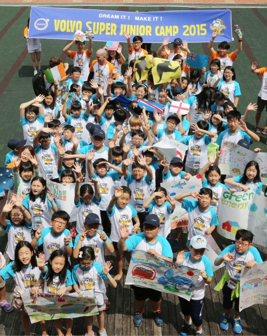 '2015 볼보 슈퍼주니어 캠프'에 참가한 어린이들이 캠프 첫 날 입소식을 갖고 단체 기념사진을 촬영하고 있다. / 볼보건설기계 제공